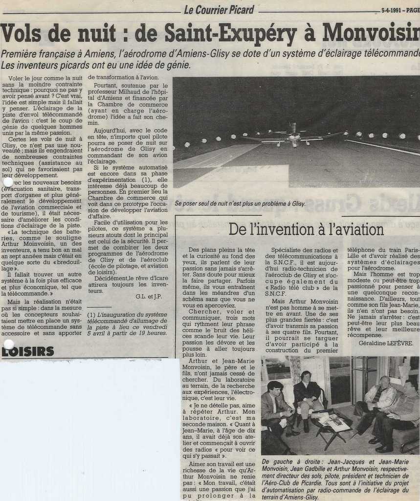 Arthur Monvoisin, père de Jean-Jacques, est décédé ce samedi dans sa 94 ème année. Bien que n’étant pas lui même pilote il fut Vice-Président de l’aéro-club de Picardie basé sur le terrain d’Amiens-Glisy. Ingénieur électronicien à la SNCF, passionné de technique , il fut le concepteur en 1992 d’un système d’allumage des feux de l’aérodrome commandé par le pilote.