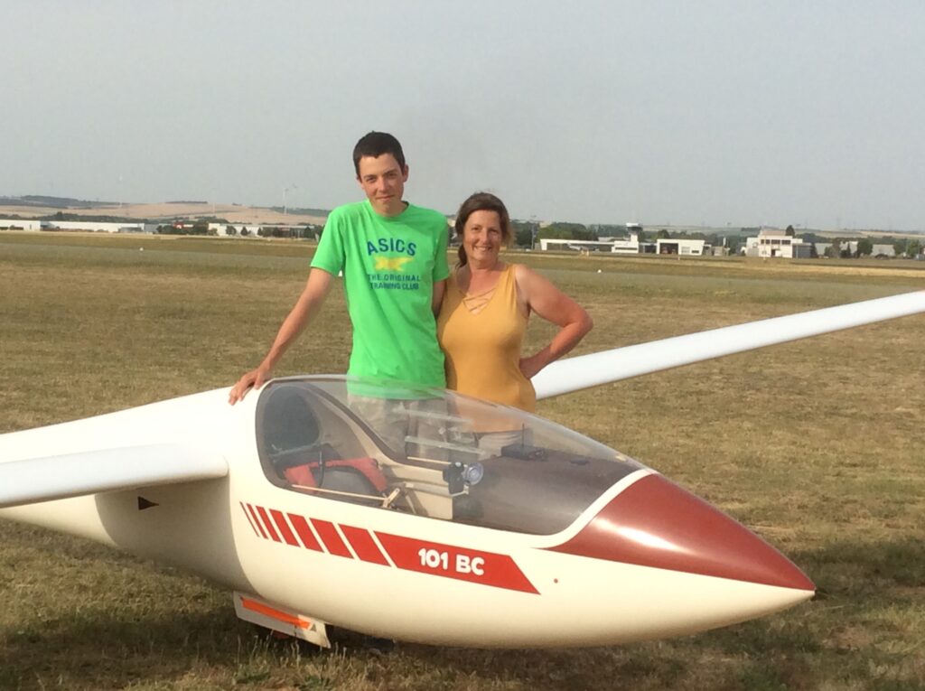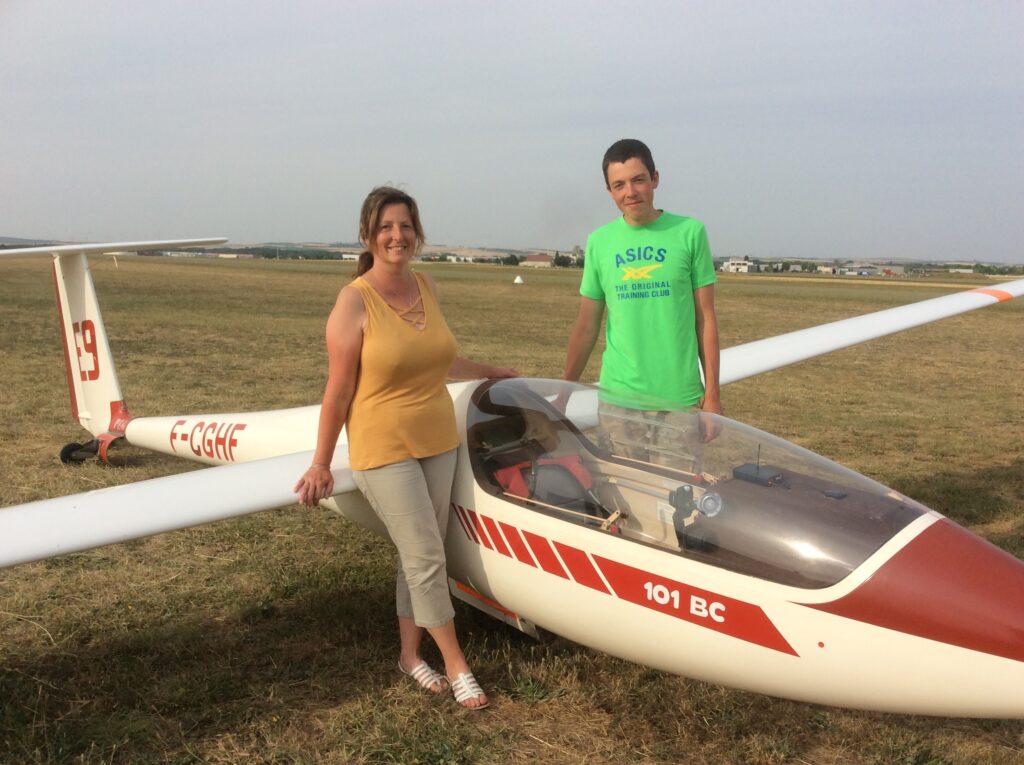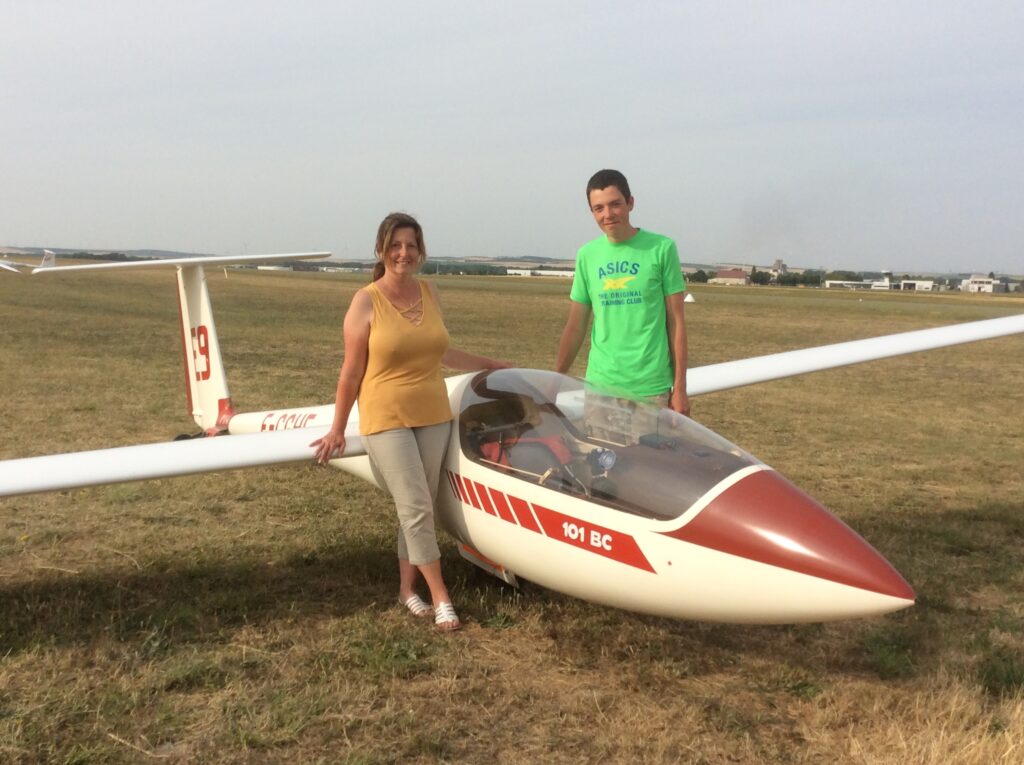 Hélène Viez, elle aussi lâchée ASK13 hier, vole depuis quelques temps et a suivi la passion de son fils Quentin, avant d’attraper le virus du vol en Planeur ! Et ça, on en guérit pas ! Aujourd’hui, elle a effectué 1h15 en solo et Quentin a réussi son 300km comme prévu ! « C’était préparé, on l’a fait ! »