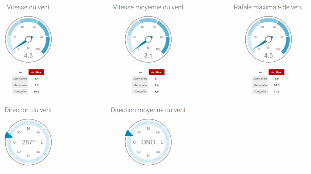 Etant donné la vocation aéronautique de notre station, les vents sont donnés en nœud (Kt) et la pression atmosphérique est donnée au niveau de la mer (QNH).