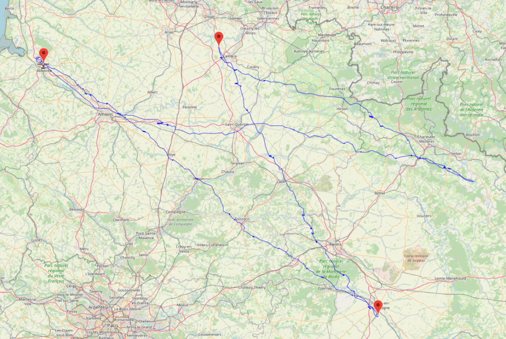 Après avoir tourné Cambrai à 15h avec 400km au compteur, je me dis qu’il est encore possible de tenter le 750km et de rentrer à Abbeville avant l’arrivée du voile de l’entrée maritime et de la brise de mer habituelle. Je prends le cap de Sedan, point de virage que j’avais déjà tourné en 2019 lors de mon 1er 600km comme prévu. Afin de rester dans le lit du vent et dans les meilleures conditions, je continue donc vers l’Est avec le vent qui me pousse, tout en sachant que j’aurais du vent de face pour rentrer et qu’il me faudra faire attention à l’affaiblissement des conditions en fin de journée. En avançant au fur et à mesure, je me rends compte que les 800km de distance libre restent possibles.